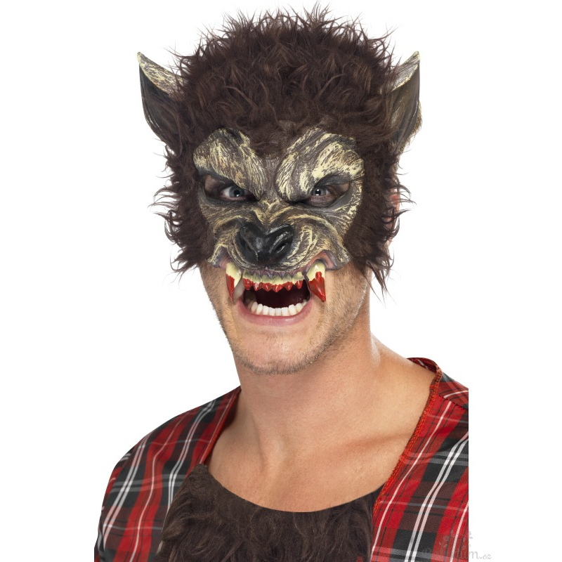 Latexová maska na půl obličeje vlkodlaka, hnědá, s kožešinou a zuby.