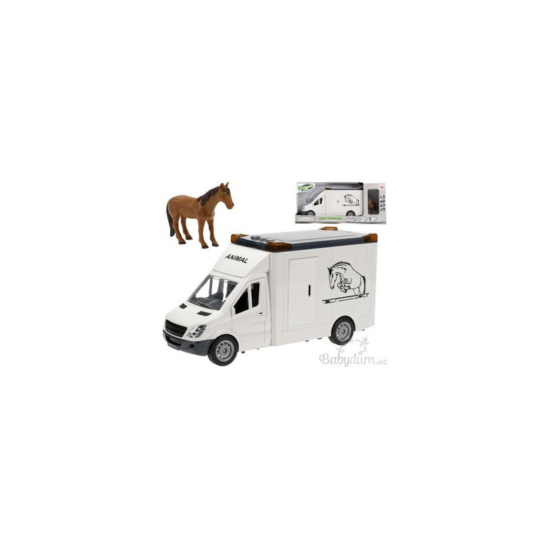 Bílá plastová dodávka určená k převozu koní, na volný chod, s figurkou koníka, pro všechny milovníky koní a dostihů. Hračka se světlem a zvukem, na baterie. Baleno v krabici.